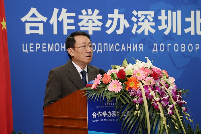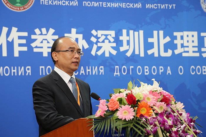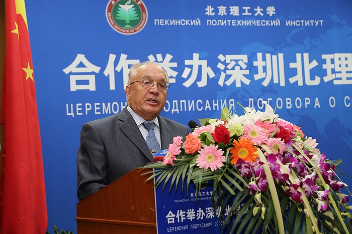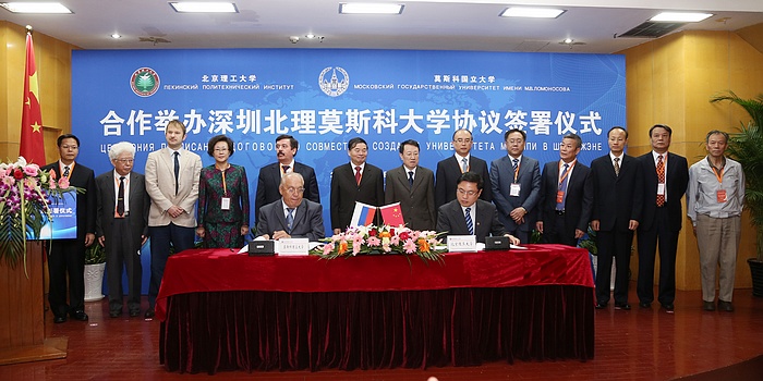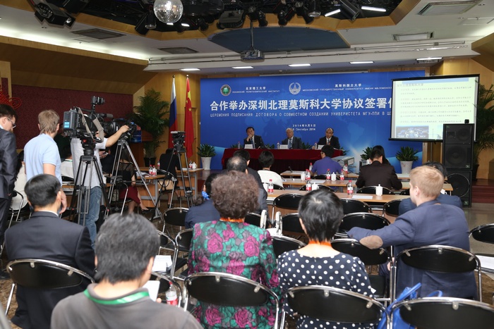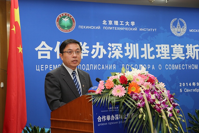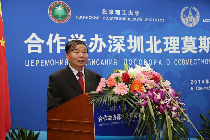 2014年9月5日上午,北京理工大学与莫斯科国立罗蒙诺索夫大学(以下简称莫斯科国立大学)合作举办深圳北理莫斯科大学协议签字仪式在京举行。北京理工大学校长胡海岩院士和莫斯科国立大学校长维克多•萨多夫尼奇院士代表两校共同签署合作协议。北京理工大学胡海岩校长、莫斯科国立大学维克多•萨多夫尼奇校长、工业和信息化部杨学山副部长、深圳市人民政府许勤市长先后在签字仪式上致辞。俄罗斯驻中国大使馆一等秘书谢尔盖•列别杰夫、教育部国际合作与交流司副司长于继海、工业和信息化部人事教育司副司长高东升、国际合作司副巡视员文勇、深圳市人民政府副市长吴以环、副秘书长黄国强、莫斯科国立大学副校长谢尔盖•沙赫莱、副校长尼古拉•西蒙、北京理工大学副校长赵长禄、周立伟院士、汪顺亭院士等各方代表共100余人出席了签字仪式。