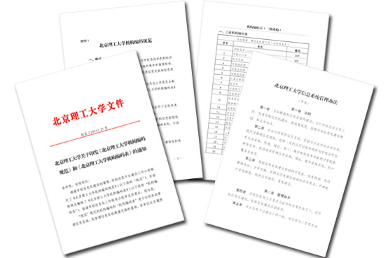 2014年,学校制定了《北京理工大学机构编码规范》,并编排《北京理工大学机构编码表》,共编排编码逾800个,包括领导小组、委员会等虚设机构等,各类部门、单位、机构、组织均实现统一编码。《北京理工大学信息系统管理办法(草案)》首次明确学校各信息系统的建设管理体制。这些制度的出台为进一步实现学校统一整体的信息系统体系奠定了基础。