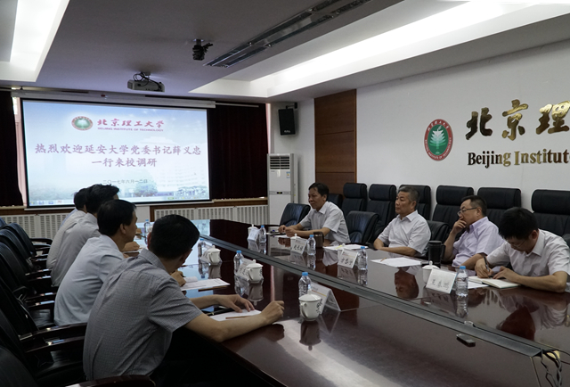 2017年6月12日下午,延安大学党委书记薛义忠、副校长王刚一行来校调研。北京理工大学党委书记赵长禄、副校长方岱宁、校长助理、学校办公室主任汪本聪会见了薛义忠一行并举行会谈。