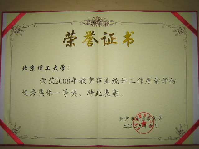 日前,北京市教委召开会议,表彰2008-2009年度北京市教育事业统计工作优秀集体和优秀个人。北京理工大学等6所高校被评为北京市统计工作优秀集体一等奖,北京理工大学桑硼飞同志被评为北京市统计工作优秀个人一等奖。