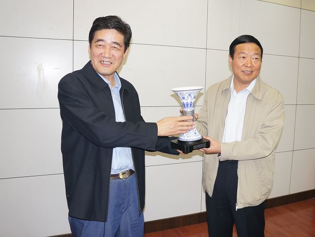 赵显利副校长向河南理工大学赠送礼物“欣欣向荣”