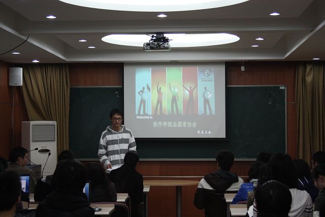 2010年3月30日晚七点,软件学院在软件楼207报告厅志隆重举行愿者协会了成立仪式,软件学院学生工作办公室主任兼分团委书记陈杰浩老师,研工委书记兼分团委副书记刘博联老师,就业办公室主任柳文艳老师以及分团委副书记董大海老师出席了成立仪式,会议由志愿者协会2009级研究生理欢理事长主持。
