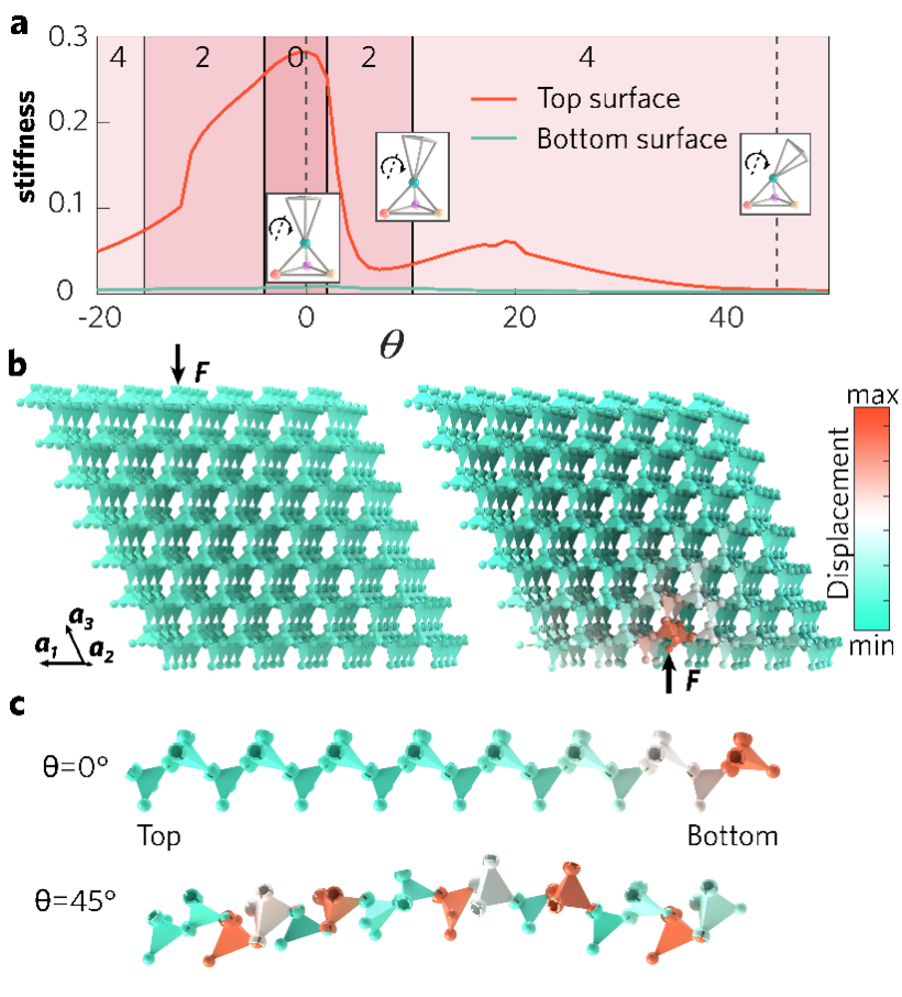 实验上,该团队对3D打印的广义焦绿石晶格进行了力-位移测量,图4(c, d)分别展示了θ="0°的完全拓扑极化相和θ=45°的外尔相的力-位移曲线。有别于外尔相上下表面近乎相同的力-位移曲线,完全拓扑极化的晶格,其上下表面的力-位移曲线展现出了显著的差异,表明力学软模只局域于晶格底部,晶格上表面则因此具有拓扑保护的刚度。