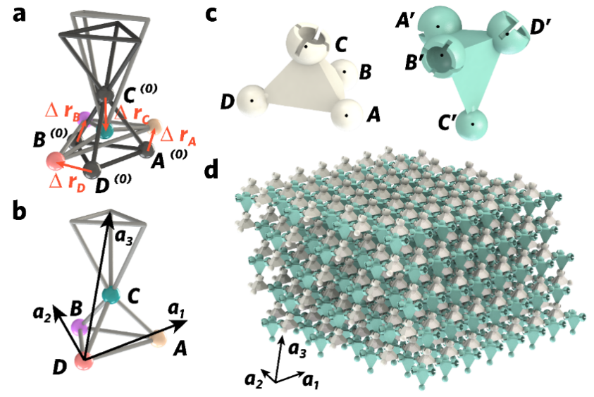 北京理工大学团队提出了力学转移矩阵方法(mechanical transfer matrix),通过分别研究各个力学软模在空间上的传递行为,建立了各个力学软模与结构的几何参数之间直接的联系,使得通过调整参数令所有力学软模局域于结构某一特定表面成为可能。基于这一理论创新,该团队设计并3D打印了一个拓扑完全极化的广义焦绿石晶格(generalized pyrochlore lattice)。该团队创新性地采用了可自由转动的球形铰链(如图1c所示) 来消除晶格连接处的弯曲刚度,以此保证3D打印出的广义焦绿石晶格是一个理想的等静定结构。广义焦绿石晶格的原胞由两个3D打印的四面体组成,四面体的每个顶点都有一个球形铰链。在图1(d)中,白色四面体的A、B、C、D顶点与绿色四面体的A′、B′、C′、D′顶点相连,使得相邻四面体之间可以自由旋转。