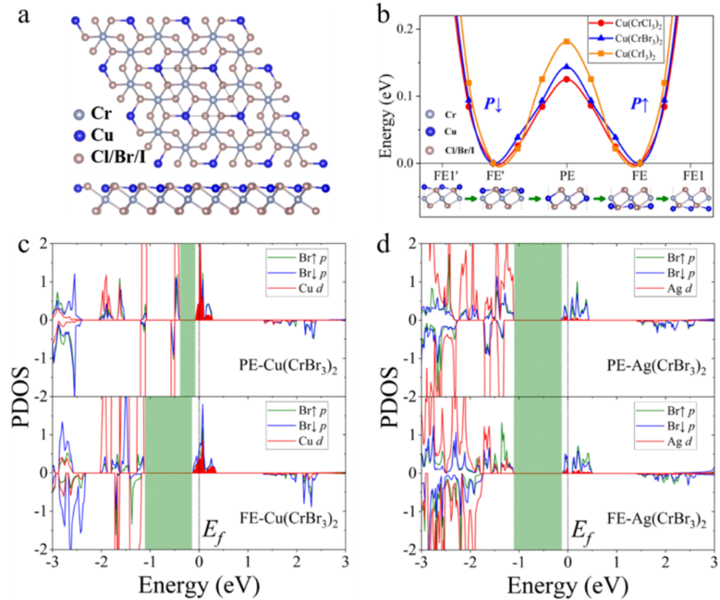 图1 单层Cu(CrX3)2原子结构和投影态密度图