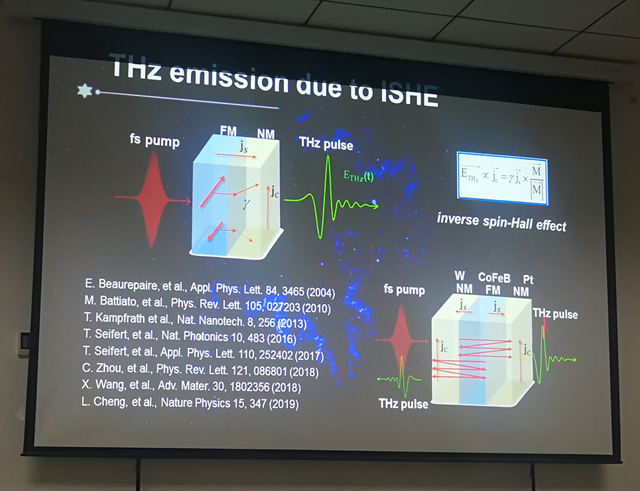 之后介绍了利用磁性纳米薄膜、拓扑绝缘体产生高效率、宽频带、偏振可调谐、低成本新型太赫兹辐射源及辐射机理。这种源的核心器件是通过磁控溅射工艺生产的,制造成本非常低廉,同时又具有较好的性能,因此未来商业应用的潜力非常大。