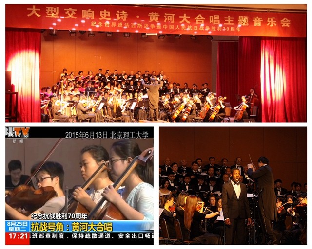学校于6月13日晚在中关村校区文化剧场隆重举行了交响史诗黄河大合唱——纪念中国人民抗日战争暨世界反法西斯胜利70周年主题音乐会。党委副书记副校长项昌乐与数百名师生一起在音乐中缅怀先烈,共同纪念中国人民保家卫国、争取和平的光辉历史。中央电视台《新闻直播间》栏目对本次音乐会进行了报道。音乐会中,我校交响乐团、学生合唱团演奏演唱了交响史诗《黄河大合唱》多个经典选段,还与教工合唱团一起演唱了《松花江上》等经典爱国歌曲。